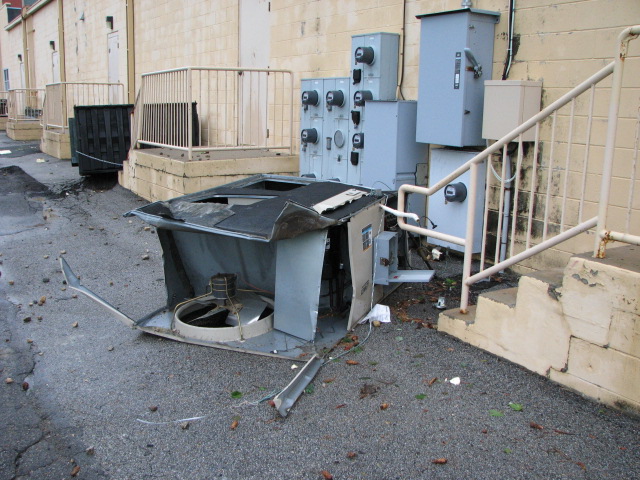 As the tornado came through, it pulled one air conditioning unit off its supports, and threw the other unit